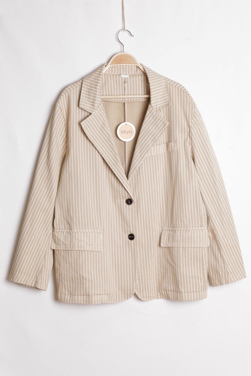 Kevyt ja tyylikäs raidallinen bleiseri, joka on valmistettu puuvillasekoitteesta. Klassinen malli, jossa on kaulukset, nappikiinnitys edessä sekä taskut. Pienet raidat ja neutraali sävy tekevät bleiseristä helposti yhdisteltävän moniin eri asuihin.
